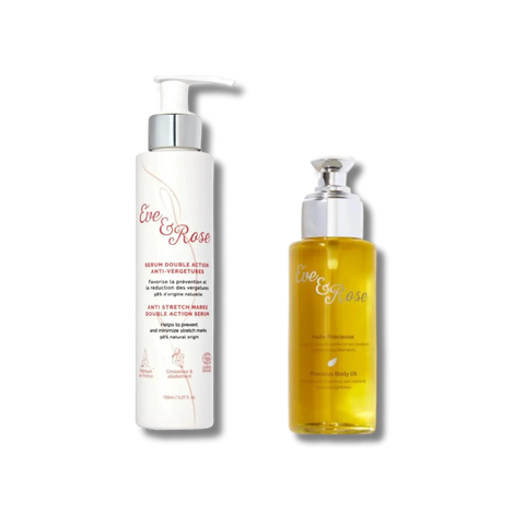 Adoptez ces deux formules phares pour votre grossesse pour prévenir et atténuer les vergetures grâce à ces deux soins très concentrés en actifs naturels.